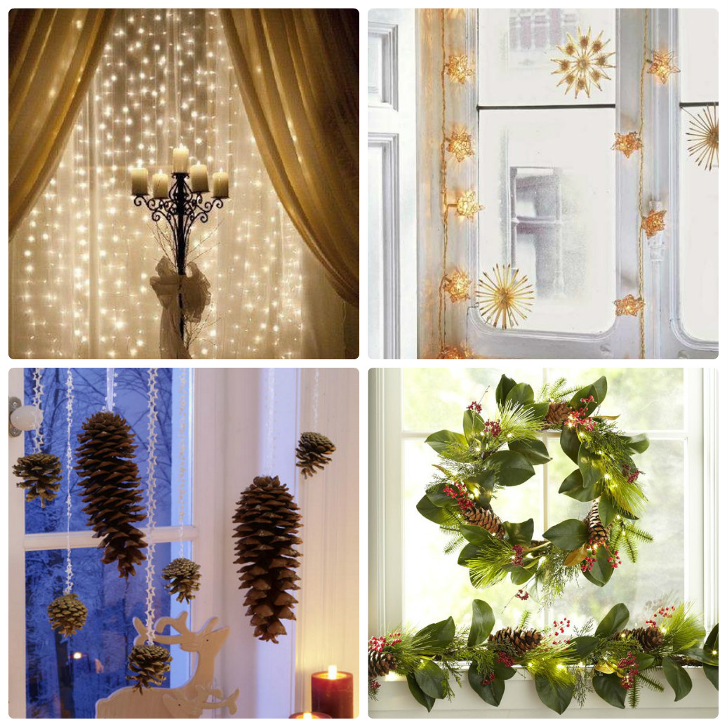 Окна можно украсить сосновыми венками, гирляндами из перьев, орехов и жемчуга.