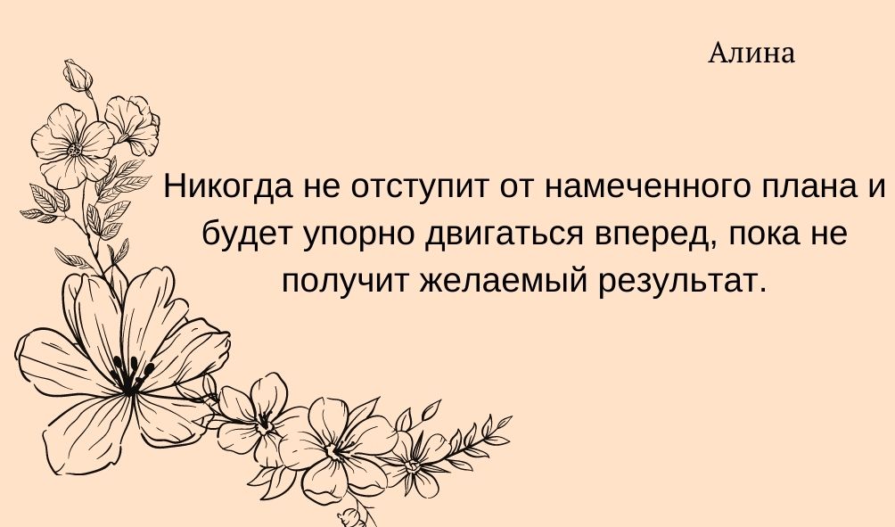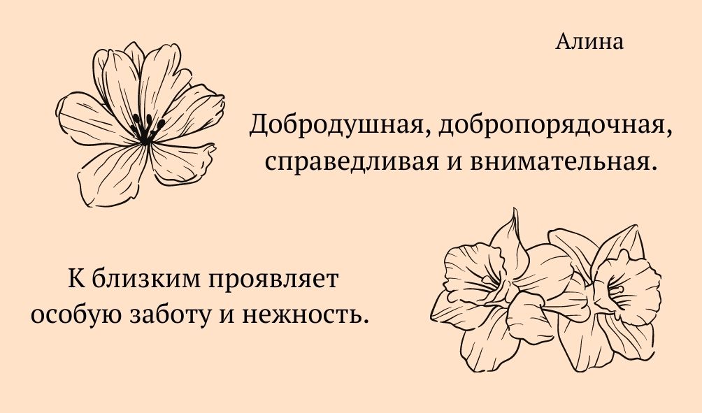 Рожденная летом обладательница имени Алина – крайне деловая, амбициозная и расчетливая личность. Зимняя, наоборот, импульсивна и рассеяна, склонна вести беспорядочный образ жизни.