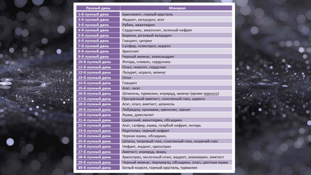 Как известно, на человека оказывают влияние не только планеты, но и спутник земли Луна. Еще в Древнем Китае считали, что вся неживая природа (в том числе минералы) подчиняется Луне. Учеными установлено, что самоцветы способны нейтрализовать ее негативное влияние и усилить положительное – в определенные дни магическая сила минералов возрастает или убывает. Какие камни следует лучше всего носить по лунному календарю указано в таблице: