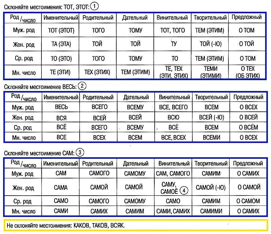 | В. п. | весь (всего) самого любой (любого) другой (другого) | все само любое другое | всю саму любую другую | все (всех) самих любые (любых) другие (других) |