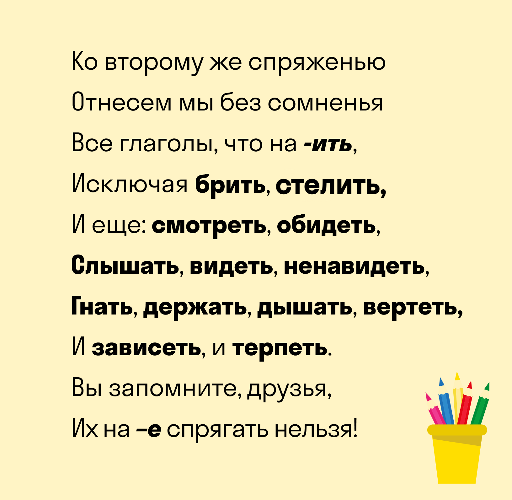Чтобы запомнить глаголы-исключения можно выучить стишок: