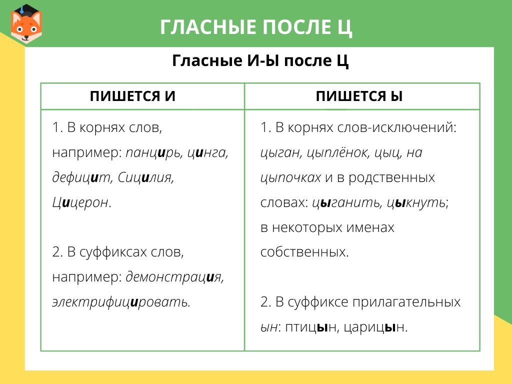 И после Ц также пишется в словах, оканчивающихся на -ЦИЯ и производных от них: акация, инструкция, организационный и так далее. Ы после Ц пишется в суффиксах и окончаниях существительных и прилагательных: сестрицын, царицын, огурцы, молодцы и так далее.